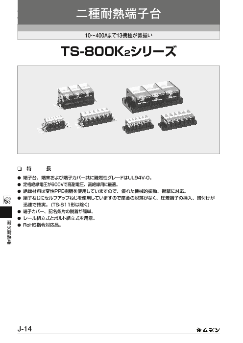 ❏特長● 端子台、端末および端子カバー共に難燃性グレードはUL94V-0。● 定格絶縁電圧が600Vで高耐電圧、高絶縁用に最適。● 絶縁材料は変性PPE樹脂を使用していますので、優...
