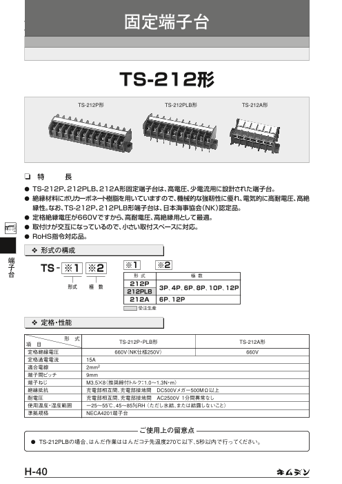 ◆TS-212P、212PLB、212A形固定端子台は、高電圧、少電流用に設計された端子台。◆絶縁材料にポリカーボネート樹脂を用いていますので、機械的な強靭性に優れ、電気的に高...