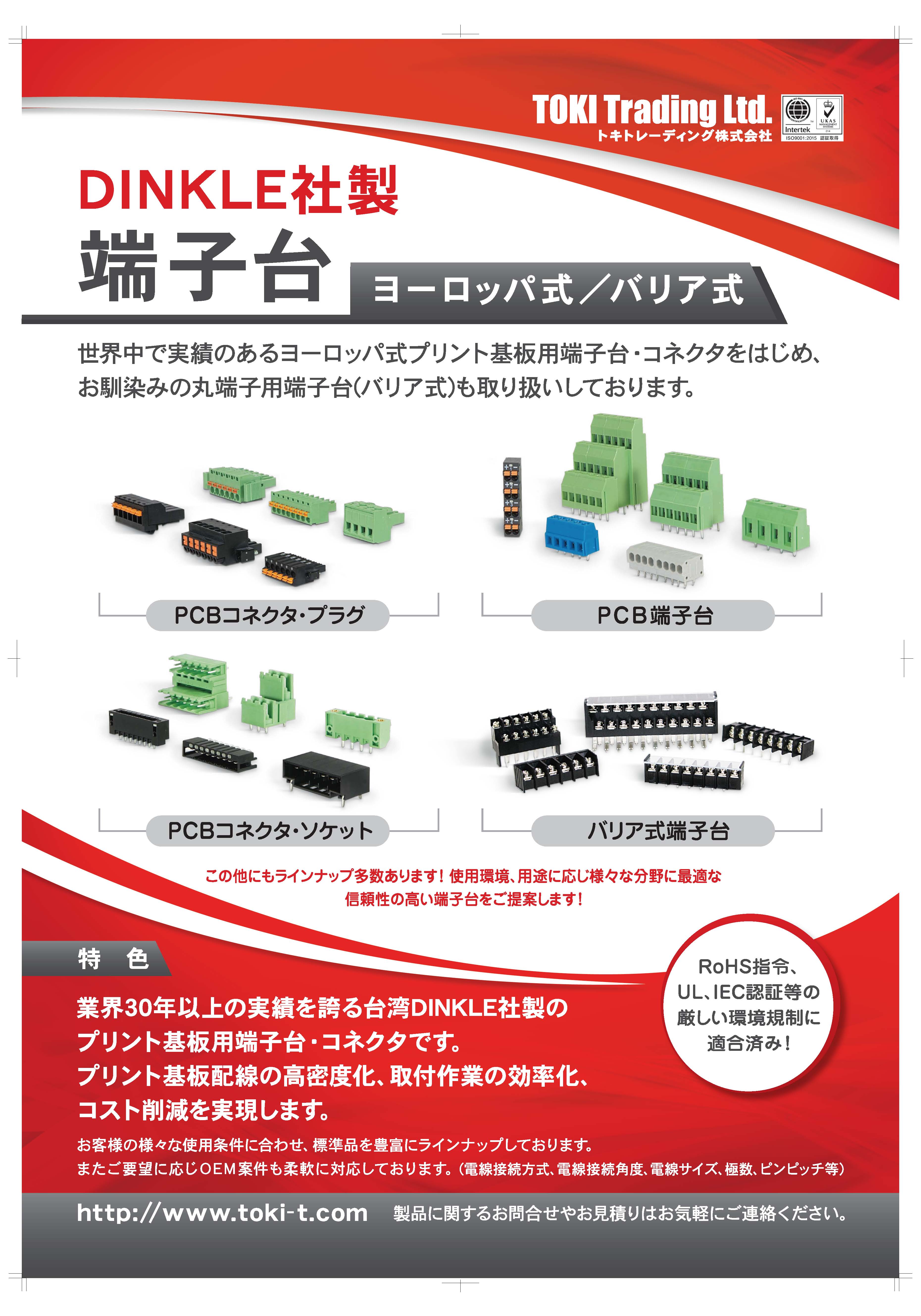【特徴】業界30年以上の実績を誇る台湾のDINKLE社製のプリント基板用端子台・コネクタです。プリント基板配線の高密度化、取付作業の効率化、コスト削減を実現します。