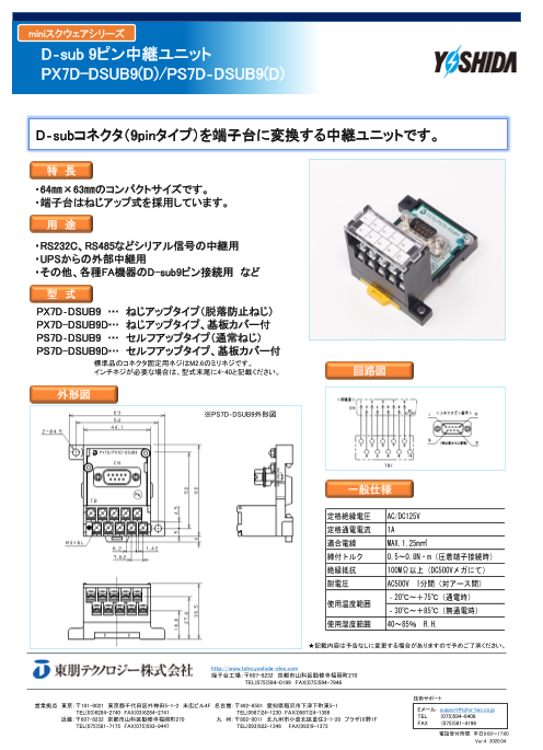 【特徴】◆D-subコネクタ(9pinタイプ)を端子台に変換する中継コネクター端子台◆64mm×63mmのコンパクトサイズ【型式】■PX7D‐DSUB9…ねじアップタイプ(脱落防止ねじ)...
