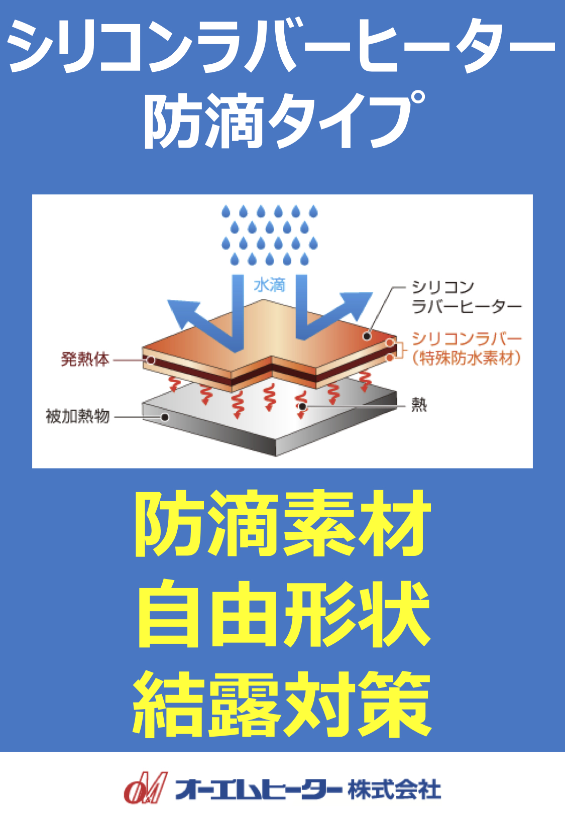 カタログには用途例や水中絶縁試験データを記載。ポンプ凍結防止や、カメラレンズ曇...