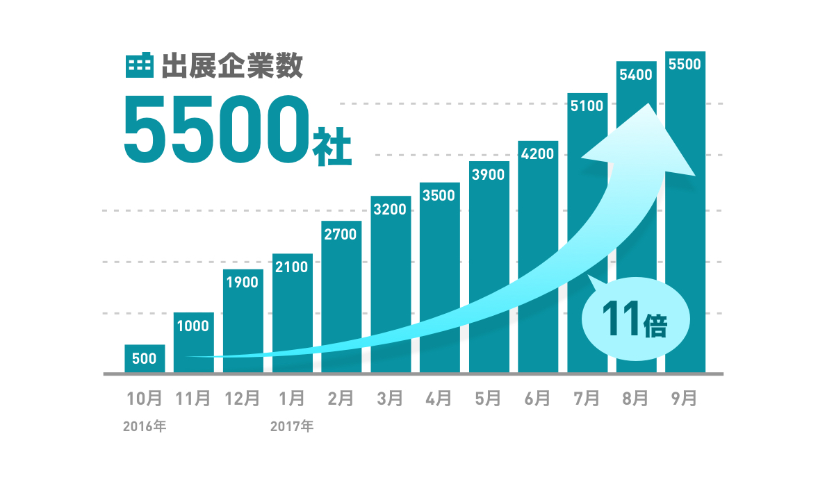リリースから1年が経った現在、約500社であった出展企業数は11倍の約5,500社を超える規模となり収録カタログ点