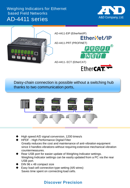 The AD-4411 is a weighing indicator that can convert signals from strain gauges load cells and connect them to an Ethernet-based field networks.