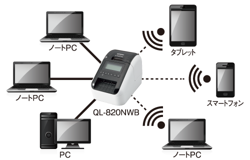 あらかじめテンプレートを本体に転送しておけば、バーコードリーダーなどの入力機器とプリンターを接続することでパソコンを介さずに可変データを含むラベル作成が可能。