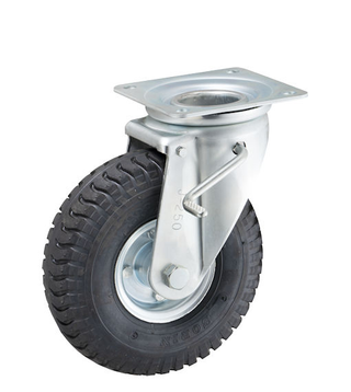 クッション性が必要とされる場所に使用される産業車輌用ストッパー付旋回キャスターです。用途により空気入りタイヤ、エアーレスタイヤ、空気入りタイヤと同等のクッション性のノーパンクタイヤが装着できます。