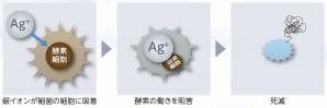 抗菌フィルタに含まれる銀イオンが細菌を吸着し、細菌の酵素の働きを阻害して死滅。