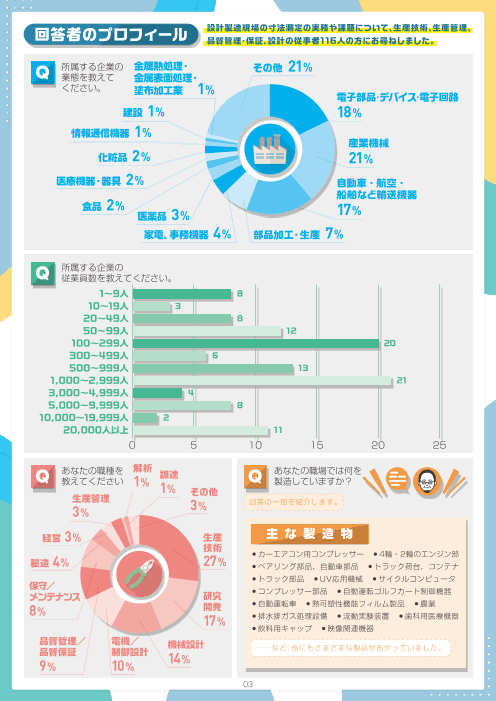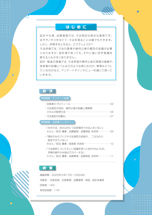 設計・製造の現場では、寸法評価や幾何公差の実務の推敲や、技術者の知識レベルはどのような感じなのか、教育はどうしているのかなど、アンケートやインタビューを通じて探っていきます。