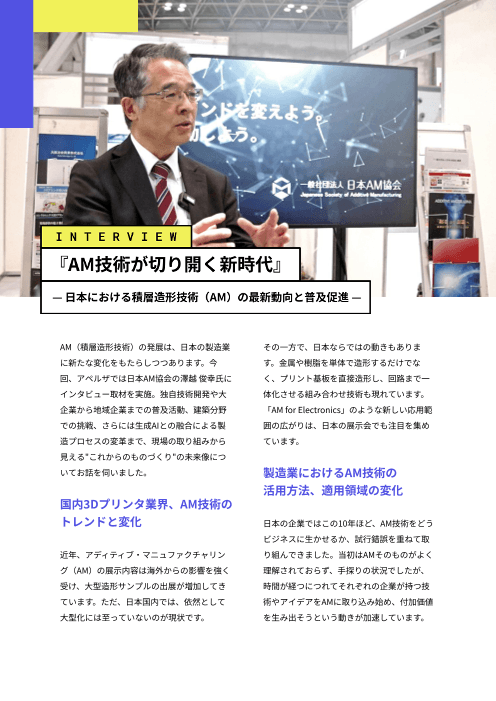 AM(積層造形技術)の発展は、日本の製造業に新たな変化をもたらしつつあります。今回、アペルザでは日本AM協会の澤越 俊幸氏にインタビュー取材を実施。独自技術開発や大企業から地域企業までの普及活動、建築分野での挑戦、さらには生成AIとの融合による製造プロセスの変革まで、現場の取り組みから見える"これからのものづくり"の未来像についてお話を伺いました。