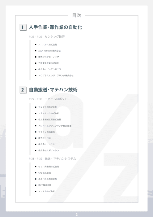 【掲載企業】CKD株式会社、IDEC株式会社、SMC株式会社、XELA Robotics株式会社、アイズロボ株式会社、アジリル株式会社、アドバンテック株式会社、アローズエンジニアリング株式会社、イグス株式会社、オーム電機株式会社、カワダロボティクス株式会社、ジェービーエムエンジニアリング株式会社、シナノケンシ株式会社、シュメアザール株式会社、スガツネ工業株式会社、テクトレ株式会社、トウプラスエンジニアリング株式会社、トビー・テクノロジー株式会社、トライエンジニアリング株式会社、トロン株式会社、ハヤシレピック株式会社、マッスル株式会社、ヤマハ発動機株式会社、ユニパルス株式会社、株式会社FingerVision、株式会社IHI物流産業システム、株式会社Thinker、株式会社イマオコーポレーション、株式会社グーテンベルク、株式会社コスメック、株式会社スギノマシン、株式会社テイアイテイ、株式会社ニッセイ、株式会社ピーアンドエフ、株式会社マクニカ、株式会社リンクス、株式会社ワコーテック、株式会社日伝、株式会社日本ピスコ、金子コード株式会社、山洋電気株式会社、住友重機械工業株式会社、村田精工株式会社、竹中電子工業株式会社、日東工器株式会社、日本ローターバッハ株式会社