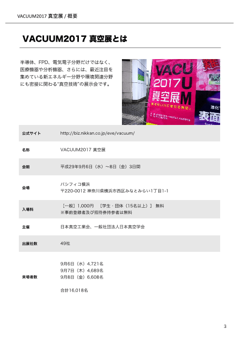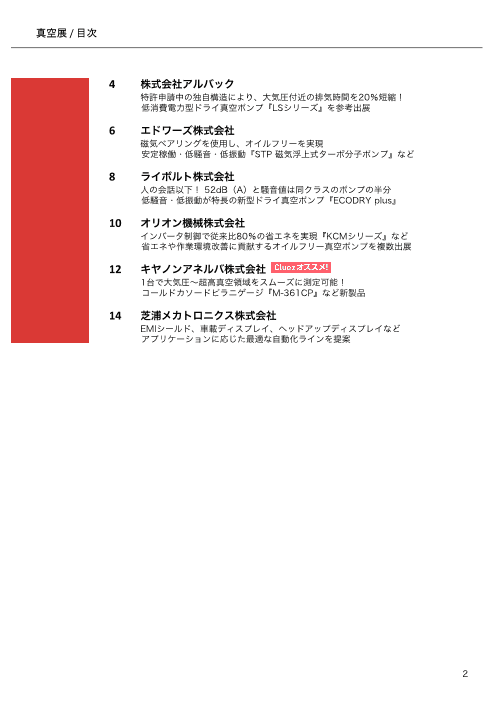 半導体、FPD、電気電子分野など幅広い分野に密接に関わる“真空技術”。「真空展」は、ドライ真空ポンプや真空計といった最新の真空技術が集まる展示会です。出展企業のカタログと展示会レポートをお届けします。