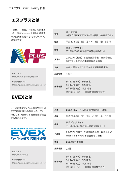 材料・機械・技術をテーマに“高機能化”“高付加価値化”を提案する展示会「N+」、EVとPHVに特化した專門展「EVEX」、衛星測位・位置情報の展示会「SATEX」。展示会レポートと出展企業のカタログをお届けします。