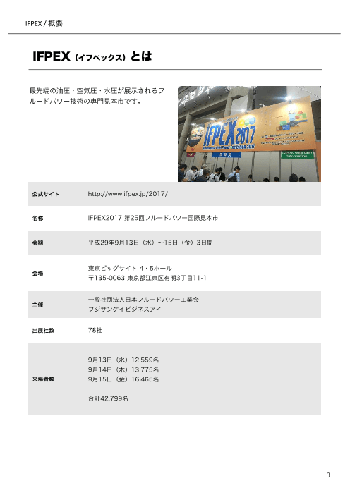 最先端の油圧・空気圧・水圧が展示される「IFPEX」は、フルードパワー技術の専門見本市。来場者数は3日間で42799名にのぼりました。出展企業のカタログと、展示会レポートをダウンロードいただけます。