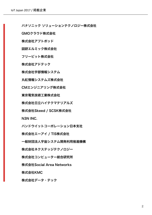 パナソニック ソリューションテクノロジー株式会社、GMOクラウド株式会社、株式会社アプトポッド、図研エルミック株式会社、フリービット株式会社、株式会社アドテック、株式会社宇部情報システム、丸紅情報システムズ株式会社、CMエンジニアリング株式会社、東京電気技術工業株式会社、株式会社日立ハイテクマテリアルズ、株式会社Skeed / SCSK株式会社、N3N INC.、パンドウイットコーポレーション日本支社、株式会社エーアイ / TIS株式会社、一般財団法人宇宙システム開発利用推進機構、株式会社ネクステッジテクノロジー、株式会社コンピューター総合研究所、株式会社Social Area Networks、株式会社KMC、株式会社データ・テック