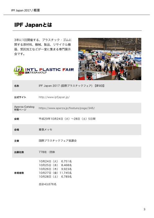 プラスチック・ゴムに関する原材料、機械、製品、リサイクル機器、受託加工が一堂に集まる「IPF Japan」。出展企業のカタログと展示会レポートをダウンロードいただけます。