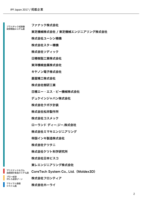 ファナック株式会社、東芝機械株式会社 / 東芝機械エンジニアリング株式会社、株式会社ユーシン精機、株式会社スター精機、株式会社ソディック、日精樹脂工業株式会社、東洋機械金属株式会社、キヤノン電子株式会社、菱屋精工株式会社、株式会社樹研工業、日精エー・エス・ビー機械株式会社、デュケインジャパン株式会社、株式会社クボタ計装、株式会社松井製作所、株式会社コスメック、ローランド ディー.ジー.株式会社、株式会社ミマキエンジニアリング、帝国インキ製造株式会社、株式会社テツタニ、株式会社ケツト科学研究所、株式会社日本ピスコ、東レエンジニアリング株式会社、CoreTech System Co., Ltd.(Moldex3D)、株式会社フロンティア、株式会社ホーライ