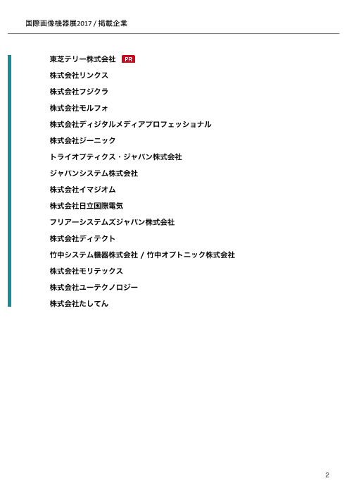 東芝テリー株式会社、株式会社リンクス、株式会社フジクラ、株式会社モルフォ、株式会社ディジタルメディアプロフェッショナル、株式会社ジーニック、トライオプティクス・ジャパン株式会社、ジャパンシステム株式会社、株式会社イマジオム、株式会社日立国際電気、フリアーシステムズジャパン株式会社、株式会社ディテクト、竹中システム機器株式会社 / 竹中オプトニック株式会社、株式会社モリテックス、株式会社ユーテクノロジー、株式会社たしてん
