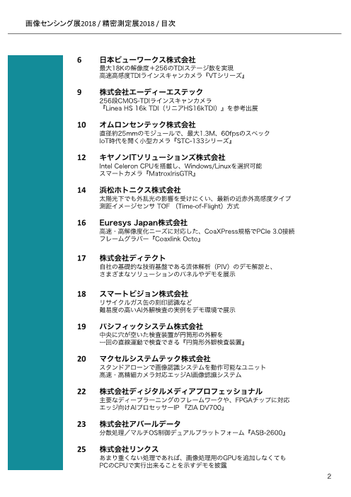 日本ビューワークス株式会社、 株式会社エーディーエステック、 オムロンセンテック株式会社、 キヤノンITソリューションズ株式会社、 浜松ホトニクス株式会社、 Euresys Japan株式会社、 株式会社ディテクト、 スマートビジョン株式会社、 パシフィックシステム株式会社、 マクセルシステムテック株式会社、 株式会社ディジタルメディアプロフェッショナル、 株式会社アバールデータ、 株式会社リンクス、 共信コミュニケーションズ株式会社、 株式会社マイクロ・テクニカ、 マシンビジョンライティング株式会社