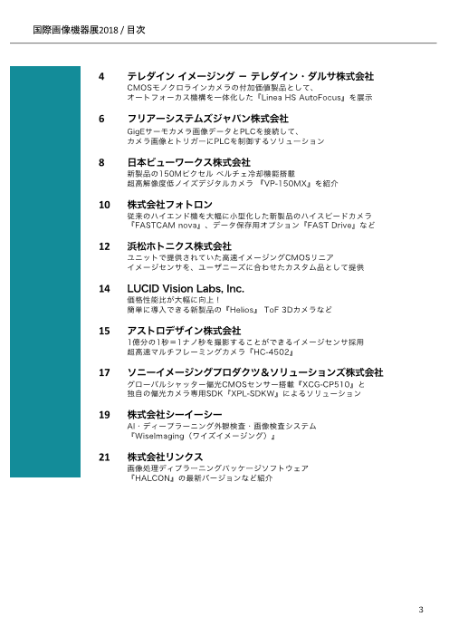 テレダイン イメージング - テレダイン・ダルサ株式会社、 フリアーシステムズジャパン株式会社、 日本ビューワークス株式会社、 株式会社フォトロン、 浜松ホトニクス株式会社、 LUCID Vision Labs, Inc.、 アストロデザイン株式会社、 ソニーイメージングプロダクツ&ソリューションズ株式会社、 株式会社シーイーシー、 株式会社リンクス