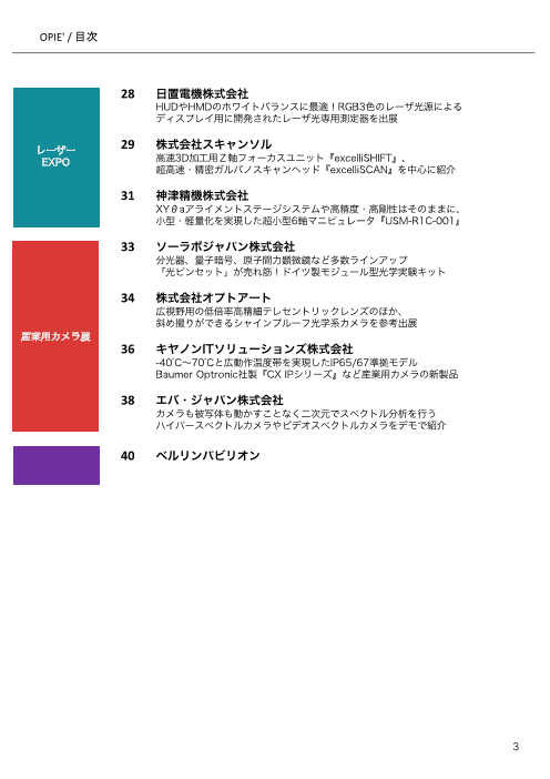 株式会社日本レーザー、 スペクトラ・フィジックス株式会社、 ウシオ電機株式会社、 株式会社東京インスツルメンツ、 株式会社オキサイド、 プネウム株式会社、 トルンプ株式会社、 株式会社ティー・イー・エム、 株式会社オプトライン/ 株式会社デルタ光器、 株式会社オプトサイエンス、 浜松ホトニクス株式会社、 エドモンド・オプティクス・ジャパン株式会社、 株式会社プロリンクス、 日置電機株式会社、 株式会社スキャンソル、 神津精機株式会社、 ソーラボジャパン株式会社、 株式会社オプトアート、 キヤノンITソリューションズ株式会社、 エバ・ジャパン株式会社、 ベルリンパビリオン