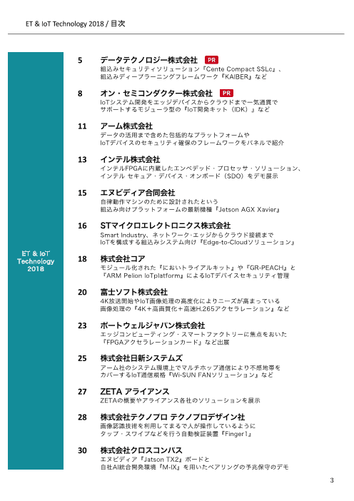 データテクノロジー株式会社、 オン・セミコンダクター、 富士ソフト株式会社、 インテル株式会社、 ZETA アライアンス、 株式会社日新システムズ、 アーム株式会社、 株式会社コア、 STマイクロエレクトロニクス株式会社、 エヌビディア合同会社、 株式会社テクノプロ テクノプロデザイン社、 ポートウェルジャパン株式会社、 株式会社クロスコンパス、 ET/IoT Technology アワード、 日本電気株式会社、 富士通株式会社、 アルプス電気株式会社、株式会社NTTデータ経営研究所、 LeapMind株式会社、 株式会社シード、 株式会社ロビット、 STARWING Technology Co.