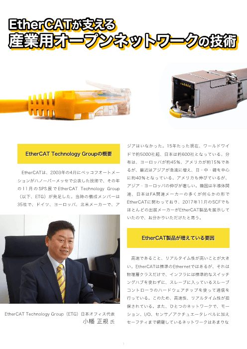 アペルザにおいても2017年9月「トヨタが選んだつなげる規格『EtherCAT』特集」として第一弾の特集を組んだ。それから一年、EtherCAT Technology Group 日本オフィス 小幡正規代表に最近の取り組み状況を聞いた。本特集では、アペルザ独占取材コンテンツを公開する他、EtherCAT Technology Group メンバー企業各社の取り扱う様々な製品を紹介する。