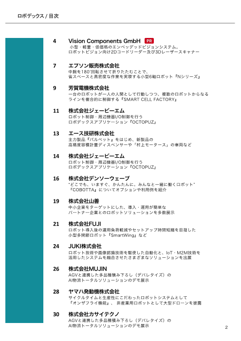 Vision Components GmbH、 エプソン販売株式会社、 芳賀電機株式会社、 株式会社ジェービーエム、 株式会社デンソーウェーブ、 株式会社山善、 株式会社FUJI、 JUKI株式会社、 株式会社MUJIN、 ヤマハ発動機株式会社、 株式会社カサイテクノ