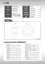 仕様例 型式名 LUK-S-30MN 許容過負荷 150% 圧縮:30 MN 非直線性 ±0.5 %RO 定格容量 引張:10 MN ヒステリシス ±0.5 %RO 温度補償範囲 -10~70°C 2.0 mV/V 定格出力 (4000×10 - 6 ひずみ) 許容温度範囲 -20~80°C ±2%(30 MN負荷時) 質量 1100kg 外観図 単位:mm お問い合わせはお近くの弊社営業所まで □札幌営業所 □名古屋営業所 営業課 TEL.011-642-8877 FAX.011-642-8866 TEL.052-774-8111 FAX.052-774-8100 □東北営業所 中部エンジニアリング課(インフラ営業部) TEL.022-771-6355 FAX.022-371-7130 TEL.052-778-6450 FAX.052-778-6453 □宇都宮営業所 □大阪営業所 営業課 TEL.028-634-7521 FAX.028-634-7522 TEL.06-6315-6761 FAX.06-6315-1949 □北関東営業所 関西エンジニアリング課(インフラ営業部) TEL.048-527-0710 FAX.048-527-0712 TEL.06-6315-0976 FAX.06-6315-1949 □筑波営業所 □明石営業所 TEL.029-852-1891 FAX.029-852-1893 TEL.078-917-5181 FAX.078-913-2048 □東京営業所 □広島営業所 TEL.03-5226-3551 FAX.03-5226-3570 TEL.082-293-8850 FAX.082-293-8770 □多摩営業所 □福岡営業所 TEL.042-489-7226 FAX.042-489-8399 TEL.092-411-6744 FAX.092-411-4266 □厚木営業所 □海外営業部 TEL.046-296-5660 FAX.046-295-1344 TEL.042-489-7220 FAX.042-488-1122 □豊田営業所 □ インフラ営業部 TEL.0565-37-8600 FAX.0565-37-7335 TEL.03-5226-3565 FAX.03-5226-3569 2023 年 12 月