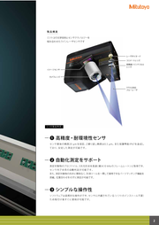 製品構造 ミツトヨの光学技術とセンサテクノロジーを 組み合わせたラインレーザセンサです レーザダイオード コリメートレンズ 高精度シリンドリカル レンズ イメージセンサ カメラレンズ クラス2対応 ブルーレーザ 3 つ の 製 品 特 長 ❶ 高精度・耐環境性センサ センサ単体の精度20 µm を保証、Z 繰り返し精度は0.5 µm。また保護等級 IP67を達成し ており、安定した測定が可能です。 ❷ 自動化測定をサポート 測定対象物のプロファイル、3次元形状を高速 ( 最大10 kHz のフレームレート) に取得でき、 センサ内で合否の自動判定が可能です。 また、測定対象物の向きに関係なく、計測ツールを一貫して適用できるパーツマッチング機能を 搭載。位置合わせをせずに測定が可能です。 ❸ シンプルな操作性 ソフトウェアは直感的な操作ができ、センサに内蔵されている(ソフトのインストール不要) ため取付け後すぐに使用が可能です。 2