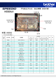 デモ加工(アルミ) 加工時間 04分47秒 H550Xd1 1,4,5,14 12,13,20 3,4,9,10,11 3,4,9,10,11 14,17,23 14,17,23 7,8 7,8 材質:A5052 15,18 5,14 < 1サイクル加工内容 > 加工条件 ツール 加工内容 加工数 工具種類 番 Vc n fr Vf AP AE 号 [m/min] [min-1] [mm/rev] [mm/min] 1 穴加工 1 D50チップ式ドリル 502.4 2,600 0.06 150 2 - - - - - - - - - 3 穴加工 2 D45チップ式ドリル 565.2 4,000 0.04 150 4 溝加工 1 D20エンドミル 502.4 8,000 0.23 1,800 5.0 20 5 ポケット加工 3 D12エンドミル 361.7 9,600 0.21 2,000 55 2 6 - - - - - - - - - 7 穴加工 2 D10ドリル 251.2 8,000 0.3 2,400 8 穴加工 2 D10ロングドリル 125.6 4,000 0.2 800 9 穴加工 2 D4.3ドリル 135.0 10,000 0.16 1,600 10 面取り 5 D12 面取りカッター 226.0 6,000 0.48 2,400 11 ねじ切り 2 M5X0.8タップ 47.1 3,000 0.8 2,400 12 穴加工 3 D9.25ドリル 290.5 10,000 0.4 4,000 13 ねじ切り 3 M10X1.5タップ 94.2 3,000 1.5 4,500 14 面取り 4 D16 面取りカッター 502.4 10,000 0.2 2,000 15 穴加工 1 D32 チップ式ドリル 552.6 5,500 0.05 300 16 - - - - - - - - - 17 穴仕上げ 2 D45.5ボーリング 285.7 2,000 0.05 100 18 穴仕上げ 1 D32.5ボーリング 244.9 2,400 0.05 120 19 - - - - - - - - - 20 仕上げ 1 D100フライス 3140.0 10,000 0.6 6,000 21 - - - - - - - - - 22 - - - - - - - - - 23 - - - - - - - - - © 2023 Brother Industries, Ltd. All Rights Reserved.