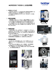 ■SPEEDIO 「H550Xd1」の主な特長 1. H550Xd1 について SPEEDIO H550Xd1 は、高生産性と優れた環境性能を発揮する 30 番主軸の、SPEEDIO シリーズ初の横形マシニングセンタです。 広い治具エリアと新開発30本マガジンにより、大物・長尺ワークの多面 加工を実現します。 2. 多彩な本体性能 標準搭載の B 軸(ローラーギヤカム)と横形主軸構成により、省スペ ースながらΦ600x580 ㎜の広い治具エリアを確保し、従来の SPEEDIO ラインアップで難しかった治具旋回径の大きなワークの搭載が可能です。 また、新開発ダイレクト ATC 方式 30 本マガジンは、最大工具長 250 H550Xd1 外観 ㎜、最大工具径125㎜、最大工具質量は4kgまで搭載可能で、様々な 加工に対応できます。 3. 生産性の追求 高効率主軸モータは、12,000min-1、16,000min-1(オプション)、 10,000min-1 高トルク仕様(オプション)を準備し、高トルク仕様では SPEEDIO 最大のベアリング径としており、高効率加工から重切削加工まで 高い加工能力を発揮します。 さらに、クーラントスルースピンドル[CTS]の耐圧7MPa 対応(オ 横形主軸構成 プション)による高能率加工や、テーブル上の積載イナーシャ推定によ る加速度調整などの最適制御により、生産性の向上を実現します。 4. 安定生産の実現 加工室とマガジン室を分離する ATC シャッターを採用、センタートラ フ構造とヘッドシャワーなど切粉対策を向上させ、さらなる安定生産を 実現します。 さらに、CNC-D00 制御により、ATC 工具監視、 加工負荷監視 などを実施することにより不良を未然に防ぐことが可能になります。 治具エリア また、電源回生システムや省エア消費などの様々な省エネ技術を搭載 し、 高い環境性能を発揮します。 30 本マガジン 大物ワーク CNC-D00 多数個取り センタートラフ構造