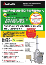 焼却炉(CI495E、CI295E)のご紹介 特徴 ➀ムラのない焼却で炉内のエア供給口は従来機の1.7倍 ②バーナーに失火自動検出機能が追加され安全性が向上 ③のぞき窓により焼却状況を把握可能 ④投入機の容積は従来機の1.2倍 ⑤ヒンジ部分を一軸にし投入機の耐久性が向上 詳しくはHPをご確認ください。