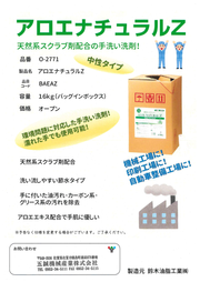 手に付いた油汚れを洗い流したいが、もっと肌に優しい手洗い洗剤がないかお探しの 皆様にご提案です。 鈴木油脂工業㈱製のアロエナチュラルZは天然系スクラブ剤配合で手に付いた油汚れや カーボン系、グリース系の油汚れを除去してくれます。 アロエエキス配合で手肌に優しく、環境問題にも対応した手洗い洗剤となります。 ご興味ある方は是非ご検討ください!