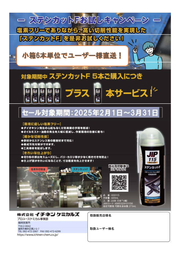 〈ステンカットFお試しキャンペーン〉 5本購入につきプラス1本サービス! ・ステンカットFの特徴 【環境にやさしい塩素フリー】 ♦オイルミスト・油煙の発生を大幅に低減し、作業環境の改善に寄与! 【確かな切削性能】 ♦工具寿命を延ばします。 【きれいな仕上がり】 ♦切粉の排出をスムーズにし、バリ・カエリ等が少なく焼き付きを防止! 〈他社製品切り替え限定セール〉 他社切り替えに限り対象とさせていただきます。 ・パーツ&ブレーキクリーナー840の特徴 ♦840mlジャンボ缶でお徳用タイプ ♦有機則、PRTR則に該当しない毒性の低い洗浄剤 ♦各種樹脂、ゴムに対する影響が少ない 100ケース限定販売となりますので、なくなり次第、終了とさせていただきます。 詳細は下記資料をご覧ください。