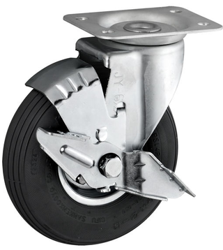 クッション性が必要とされる場所に使用される産業車輌用ストッパー付旋回キャスターです。用途により空気入りタイヤ、エアーレスタイヤ、空気入りタイヤと同等のクッション性のノーパンクタイヤが装着できます。