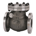 本体材質炭素鋼SCPHの鋳鋼スイングチェッキバルブです【特長】・材料・寸法などの詳細は、納入品図面をご覧ください。・JIS 10Kフランジ形付は、製品記号末尾に「F10K」が付きます。・バルブ両面シート:ハードフェーシング(硬化肉盛)は、製品記号末尾に「DS」が付きます。・呼び径150A以上は、「吊りボルト(アイボルト)付」です。・エンドフランジのガスケット座面仕上げは、「スパイラルセレーション加工」が標準です(平面仕上げではありません)。・ ドレン座及びバイパス座は、MSS規格SP-45に定める「A,B,C,D,E,F及びG」位置に設けてあります(呼び径100A以上)。・標準品は、未塗装です(呼び径250,300Aは、シルバー塗装)。指定塗装は、お見積りします。