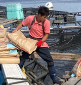 エサやりのため、20kgの袋を海上で中腰姿勢で運搬。 サポートジャケットBb+F…