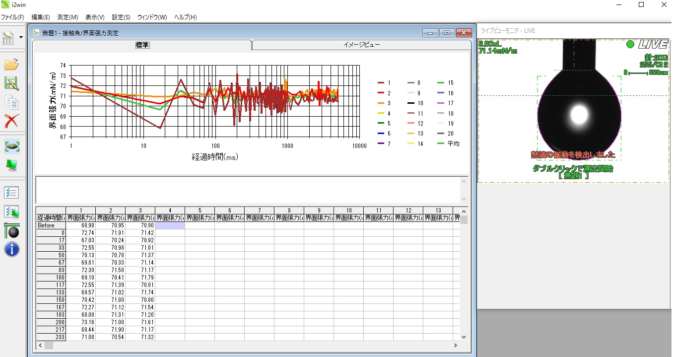 測定サンプルをご送付いただければ、測定してご返却いたします。 ※表面張力の測定は、ペンダントドロップ法、ライジングドロップ法に限ります。