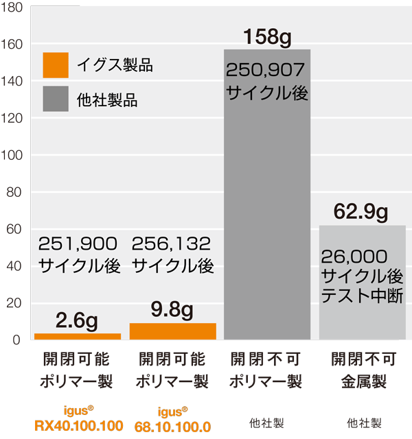 チップの降りかかる環境でRX40を25万サイクル動作後の内部侵入チップはわずか2.6gでした。IP40(外部機関によるテスト)