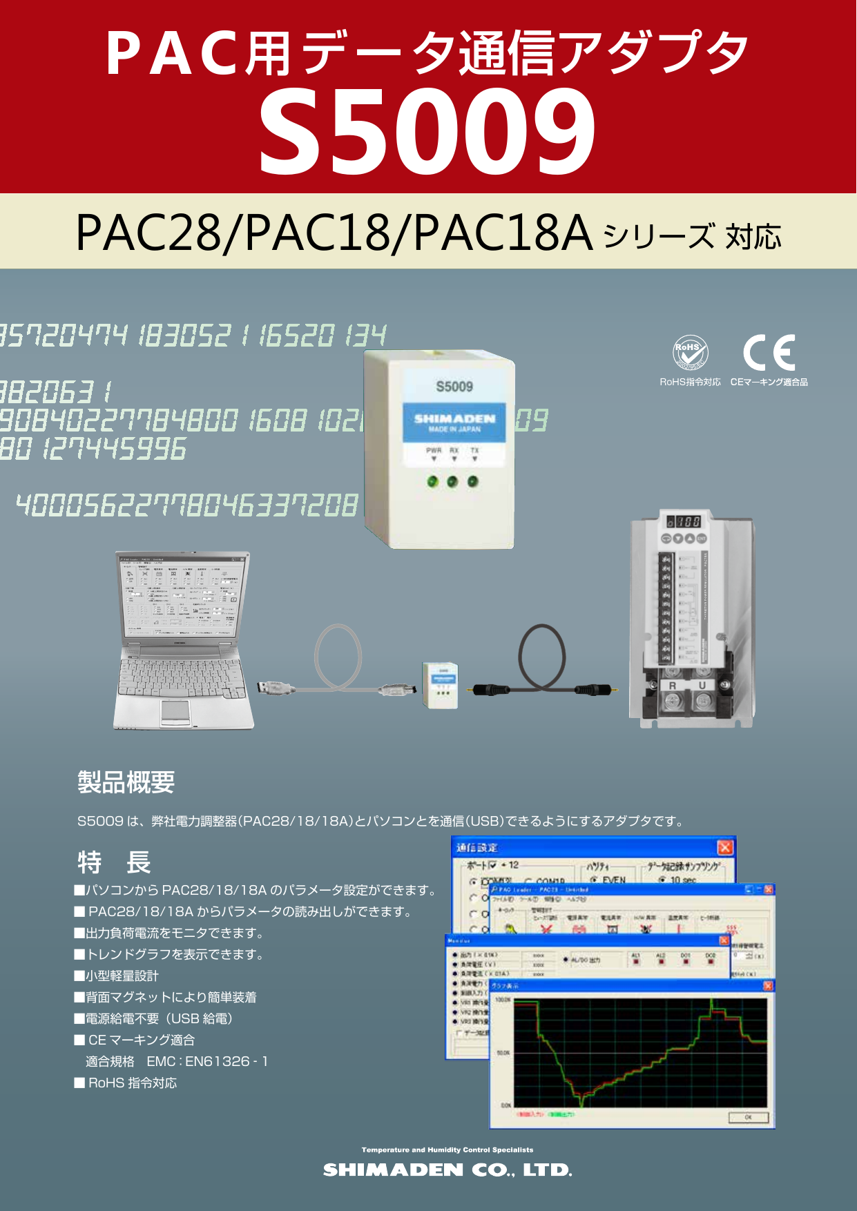 S5009は、弊社電力調整器(PAC18A,PAC28)とパソコンとを通信(USB)できるようにするアダプタです。