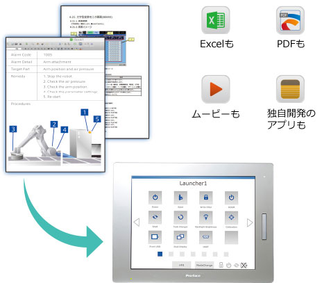 普段、パソコンを使用して作成・確認するファイルが、SP5000上ならWindowsアプリケーションを加工なしで直接起動して使用できます。 マニュアルPDFやExcelで作成したトラブルシューティングガイドなど、そのまま活かすことができるので大幅な設計工数削減につながります。