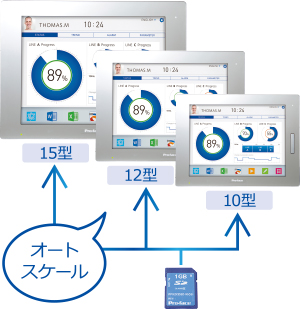 オートスケールに対応。画面データ1つで、15型・12型・10型のどれにでも使用できるので、サイズごとの画面データ作成が不要になります。