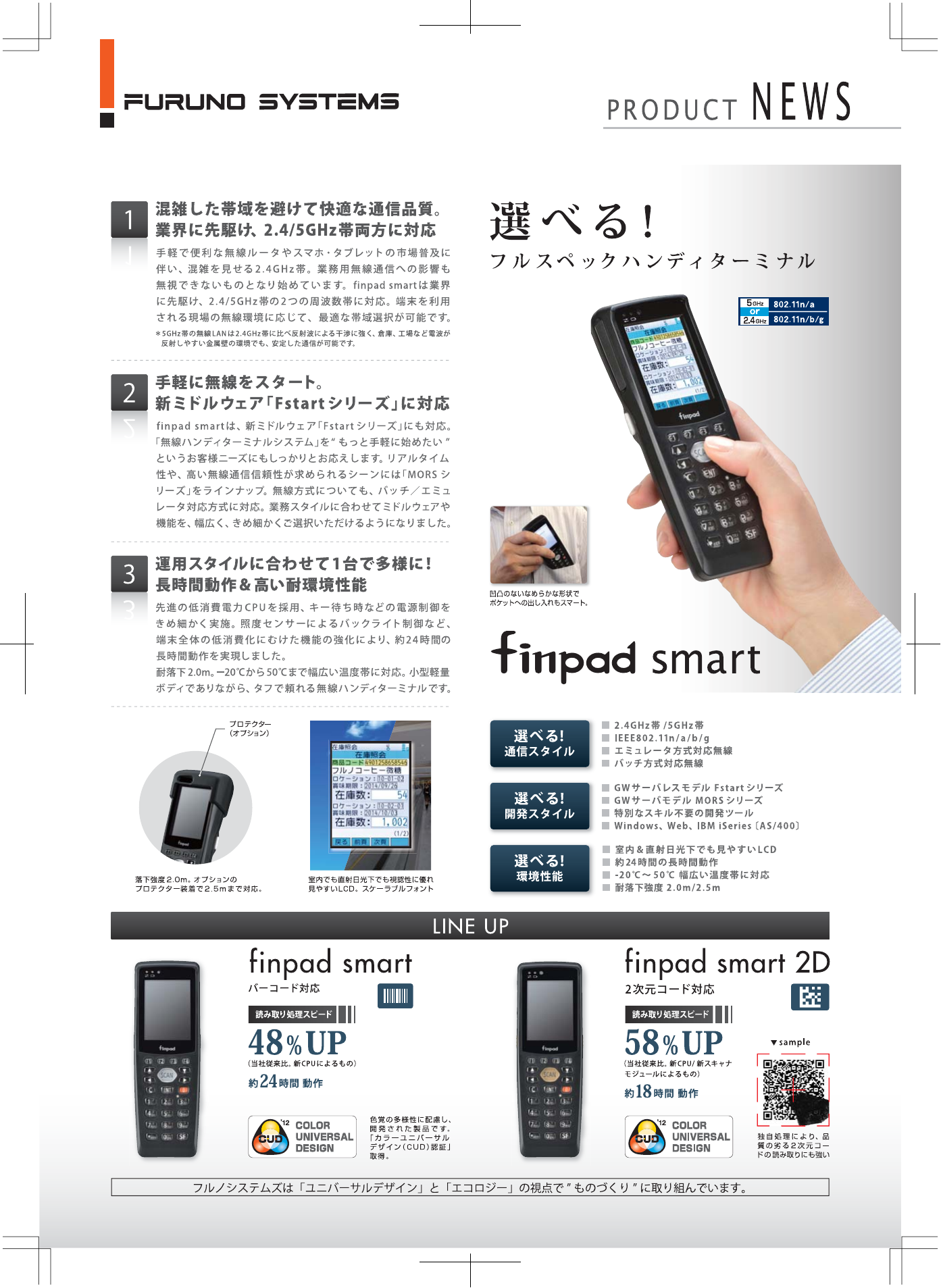 5GHz帯(802.11n/a)と2.4GHz帯(802.11n/b/g)両方に対応。エミュレータ方式対応無線/バッチ方式対応無線に対応し、シーンやニーズにあわせて、機能選択可能なハンディターミナルです。