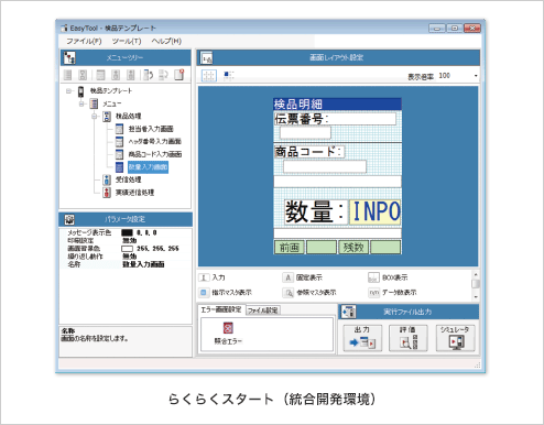 もっと手軽に「無線ハンディターミナルシステム」を始めたい。シンプルな構成をできるだけライトに作りたい。お客様のそんなご要望をかなえる「らくらく構築機能」を取りそろえました。画面作成からアプリケーションテストまで、初心者にもやさしい統合開発環境です。