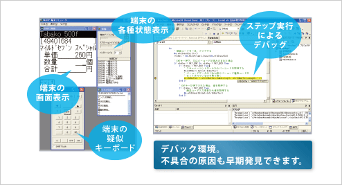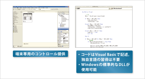 Microsoft社のVisual Studio.NET2003又は2005,2008, 2010(言語はVisual Basic及びVisual C++)で開発可能です。各種データベースも標準的な方法で利用可能(無線端末独自の処理は不要)
