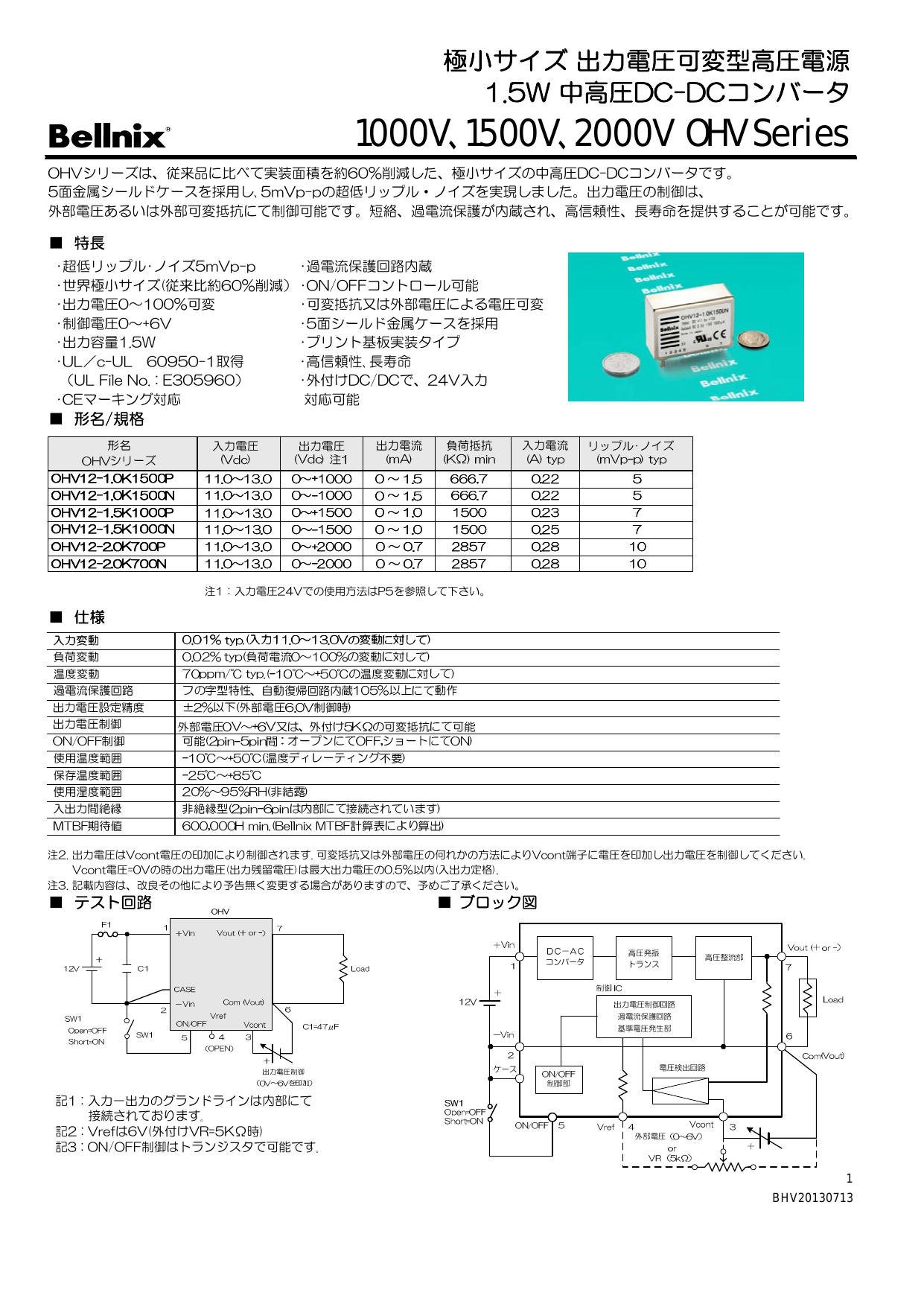 OHVシリーズは、従来品に比べて実装面積を約60%削減した、極小サイズの中高圧DC-DCコンバータです。 5面金属シールドケースを採用し、5mVp-pの超低リップル・ノイズを実現しました。出力電圧の制御は、 外部電圧あるいは外部可変抵抗にて制御可能です。短絡、過電流保護が内蔵され、高信頼性、長寿命を提供することが可能です。