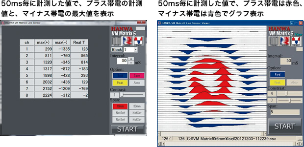 アレイ配置した8個のセンサーでエリア内を同時に測定しますので、帯電部分を見逃す事なく帯電状態を確認出来ます。