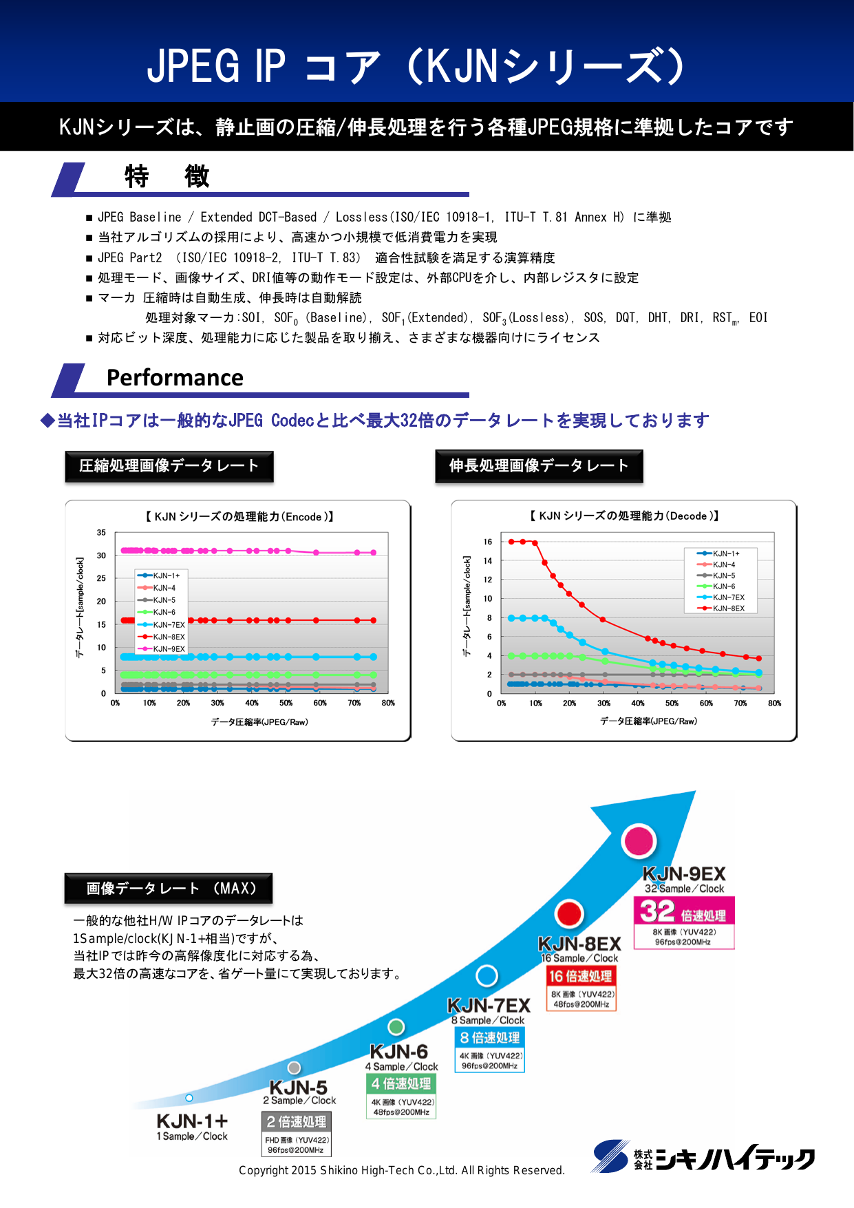 KJN-Xシリーズは、連続階調の静止画像の新しいファイル形式JPEG XRに対応したコアであり、JPEG、JPEG2000に続く国際標準の静止画像圧縮符号化方式 (JPEG XR image coding system Part2:image coding specification (ISO/IEC 29199-2) ) に準じています。