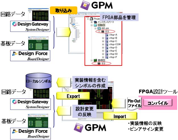 そこで、GPMは、FPGA/CPLDを用いたPCB設計を効率化するための機能を提供し、FPGA/CPLD設計と回路設計・基板設計のコンカレントな設計プロセスの実現を支援します。