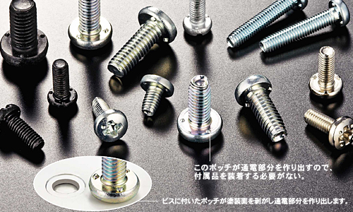 これ1本で通電機能があります。他の付属品をビスに装着する必要がありません。(塗装面を剥がす為に)塗装する際に通電部分をマスキングする手間がありません。(コストダウンになります)鍍金や塗装面を最小限で取り除く事が出来ます。(裏側をセレーションにするより効率よく塗装面を剥がすことが出来ます)繰り返しの使用が可能です。(1~3回)ソトハ座金の組み込みの場合は締め付けた時に座金が空回りして塗装面を剥がす事は出来ません。