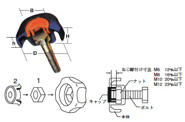 用途別に色替えが出来て色彩はユニークなツートンカラー、しかもマーク入れも出来ます。ねじのサイズ、材質は自由自在に用途に合わせて便利よくご利用いただけます。ナットをはめ込むことによって即座にノブナットの出来上がりです。センター部のキャップは、オレンジ、白、黒があります。